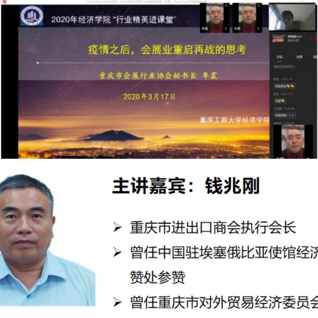 本次“行业精英进课堂”抗疫活动共6场讲座,分别进入《会展服务》《国际零售与连锁》《区域经济学》《国际经济学》《国际商务谈判》等课堂,就新冠肺炎疫情对消费市场、零售业、外贸业、物流业、会展业等领域的影响及行业企业应对进行分析。具体包括重庆市商务委员会政策研究室主任张书成《疫情对消费的影响及对策》、重庆商社(集团)有限公司人力资源部部长张泽军《新零售时代的国有零售企业管理变革——以重庆商社为例》、重庆市进出口商会执行会长钱兆刚《重庆外贸发展与疫情影响》、沐盛供应链管理(宁波)有限公司总经理杜丽娜《疫情之下,国际物流行业面临的机遇和挑战》、重庆市会展行业协会牟震秘书长《疫情之后,会展业重启再战的思考》、重庆西朗进出口贸易有限公司总经理刘丹《国际商务谈判实践》。本次系列讲座是理论和实践的高度结合,是新冠疫情背景下行业企业抗击疫情实践与各专业知识的有机融合,让同学学懂书本知识的同时,又有了行业实践体验,对自己所学专业有了更深刻的认知。